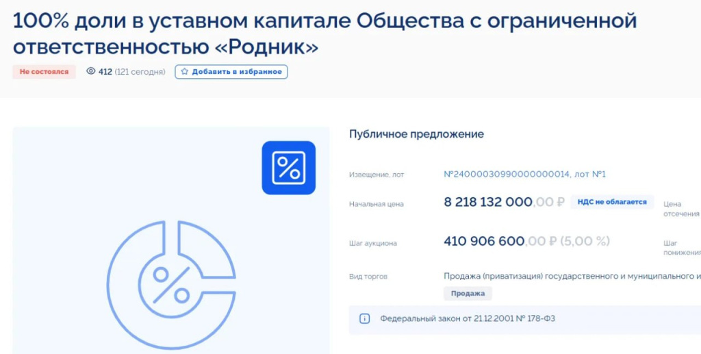Крупные активы, которые принадлежат семьям бывшего главы региона и его соратника, снова выставили за ту же стоимость. Повторные торги прошли сегодня, 7 апреля, на специализированной платформе ГИС Торги. Судя по пометке, появившимся в системе, на национализированные активы не нашлось охотников. Напомним, что имущество, которого семьи экс-губернатора Михаила Юревича и бывшего депутата Вадима Белоусова лишились в рамках национализации холдинга «Макфа», первоначально выставили на торги в конце марта. Покупателям предложили крупные лоты: активы ООО «Родник», в которые входит одноименный ТРК и огромным торговый город «Алмаз», а также активы ООО «Проспект», включающими супермаркет и теперь уже бывший кинотеатр «Победа». Стоимость первого лота оценили в 8,2 миллиарда рублей, второго – в 3,8 миллиарда рублей. Тогда предложение никого не заинтересовало, поэтому определили дату повторных торгов, выставив позиции по той же стоимости.