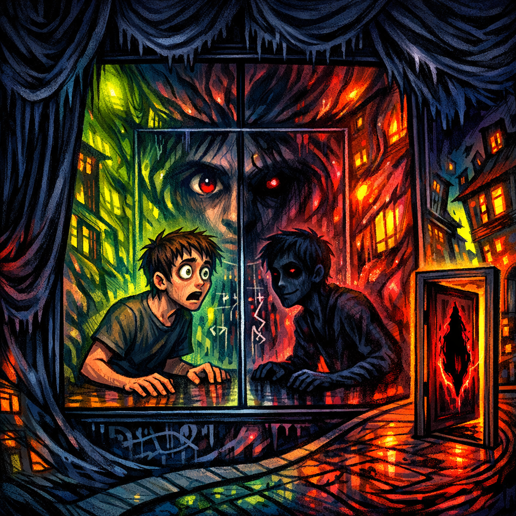 После двадцати трёх часов окна соседа становились черными — не просто темными, а словно впитывали свет, словно собирали в себя ночь и становились ей тенью, плотной и губительной. Новый сосед просил не смотреть туда, но это было так просто — как не смотреть на собственное дыхание, как не видеть свои пальцы, которые стучат по столу в полуношном тумане. В ту ночь часы сползали, как лента старой пленки, и время теряло шаг, подловленное нотой тишины, обволакивающей улицу. Пытаясь разглядеть между теней, я взглянул в его окна. Или это окно, растворявшееся в глубине моего взгляда, растворялось само? В квартире была комната — моя комната. Но стены, вместо привычной геометрии, изгибались, словно дышали, и предметы, знакомые и чужие одновременно, медленно танцевали, меняя пропорции. В углу, за книгой, сидел он — я, но уже не совсем я. Фигура двигалась с моей же скованностью, его глаза ловили мой взгляд, а губы шептали беззвучно, как будто сквозь воду: «Ты не должен был смотреть». Молча, я пытал
