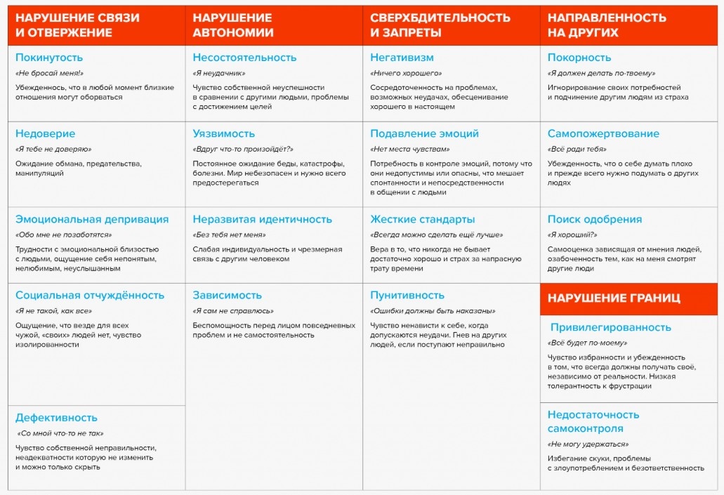 Тест оценивает 18 различных дезадаптивных схем, таких как «Брошенность», «Недоверие», «Эмоциональная депривация» и другие. Их вы видите в таблице