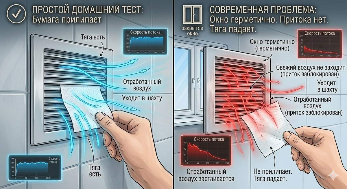 Привет, друзья! Замечали, что дома бывает душно, даже если вы только что убрались? Или запахи вчерашнего ужина намертво въелись в шторы? Первая мысль — сломалась вентиляция. Сегодня я расскажу про самый старый, «дедовский» способ проверить, работает ли вытяжка в вашей квартире, всего за 10 секунд. И объясню, почему в 90% современных квартир с пластиковыми окнами этот тест честно «врет», показывая, что всё плохо, даже если шахта чистая. Часть 1. Тот самый тест с листком бумаги Этот тест проверяет вытяжную вентиляцию — те самые решетки на кухне, в ванной и туалете, куда должен уходить отработанный воздух. Что понадобится: Один лист обычной туалетной бумаги или тонкая полоска от тетрадного листа. Не берите тяжелый картон или целую газету — тяга должна быть очень сильной, чтобы их удержать. Как проверить: Подойдите к вентиляционной решетке. Прижмите листок бумаги к ней и отпустите руку. Результат: Если листок «прилип» к решетке и держится сам — поздравляю, тяга есть, вентиляция раб