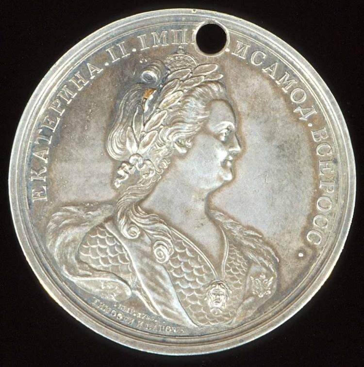 Памятная медаль Екатерины II, посвященная ее путешествию на юг России в 1787 г. Найдена на Аляске и ныне экспонируется в Национальном музее города Джуно (штат Аляска, США). Подобные медали русские колонисты выдавали тоенам из алеутов или индейцев за неимением другой известной медали, специально изготовленной с этой целью – «Союзные России». В екатерининской медали просверлено отверстие: её носили на шее в качестве украшения и одновременно знака российского подданства.