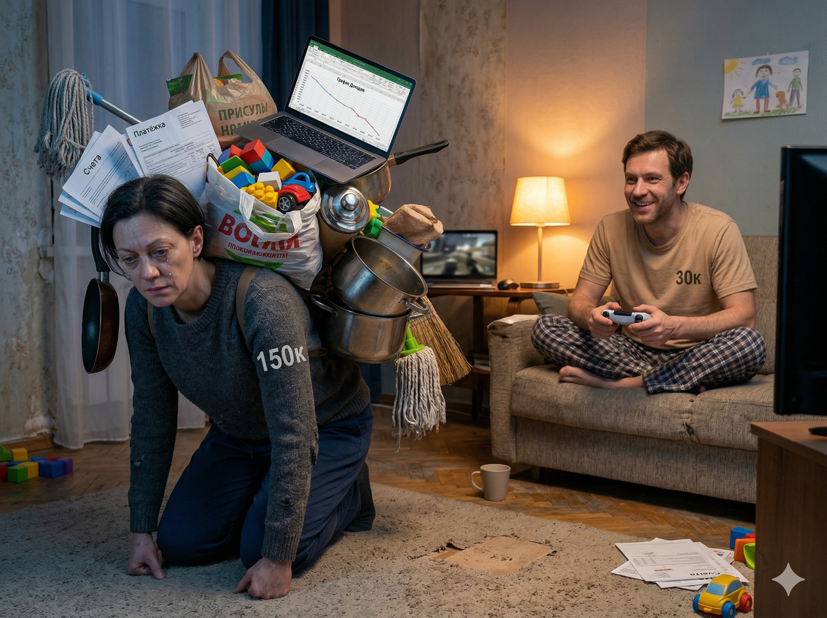 — Всё я, — плачет Наталья. — Он говорит, что «домашнее — это женское». Но я же тоже работаю! Я больше работаю!