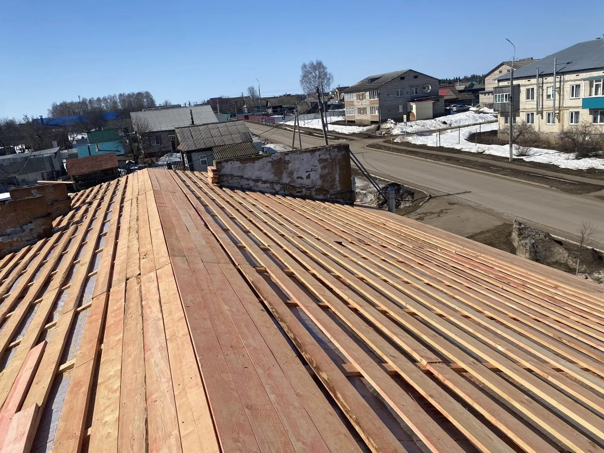 Сначала строители сняли старое кровельное покрытие и заменили повреждённые элементы стропильной системы. Затем установили новые стропила, отремонтировали слуховые окна и уложили ветро- и гидрозащитную мембрану. После этого сделали контробрешётку и обрешётку, а все деревянные конструкции обработали огне- и биозащитой.
