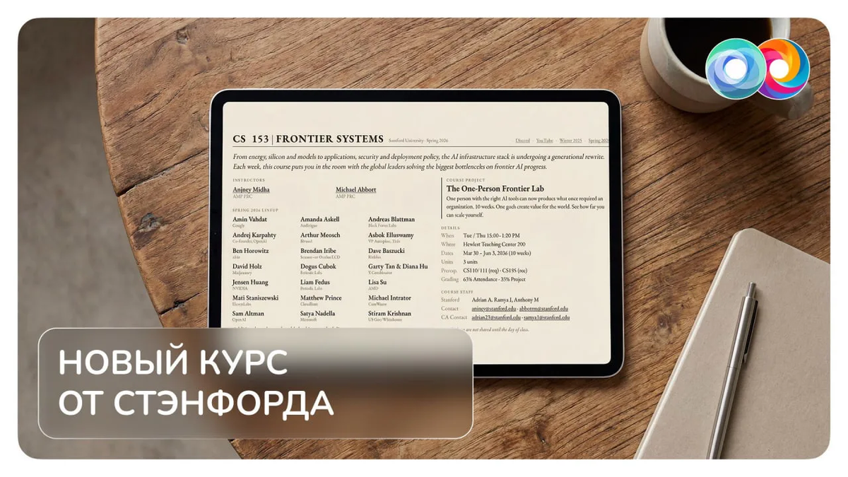 Стэнфорд запустил курс, где лекции читают топ-менеджеры ведущих ИИ-компаний. Вместо скучной теории — реальный опыт главных людей в мире нейросетей. За 10 недель можно послушать сооснователя OpenAI Андрея Карпаты, CEO OpenAI Сэма Альтмана, CEO NVIDIA Дженсена Хуанга, CEO Microsoft Сатью Наделлу и других лидеров индустрии.