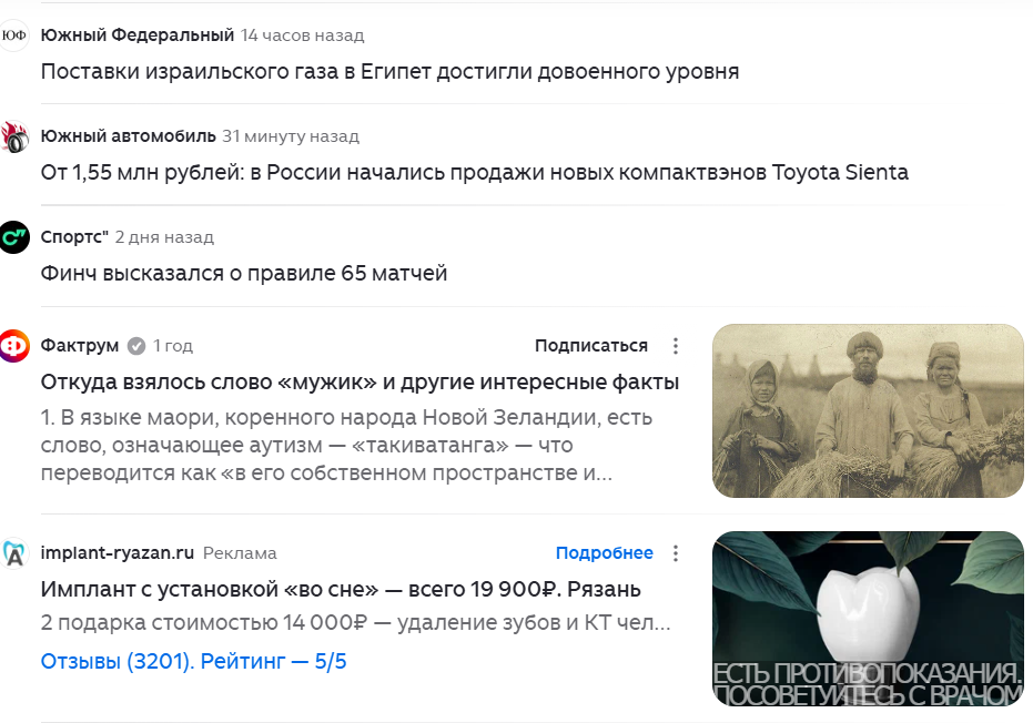 Вообще, идея публиковать в одной ленте вперемешку и новости… которые тоже, кстати, вперемешку: спорт рядом с экономикой, происшествия вместе с политикой… Новости вперемешку идут вперемешку со статьями и рекламой – ну это отвратительное хрючево и жуткий треш. Я попробовал полистать…
