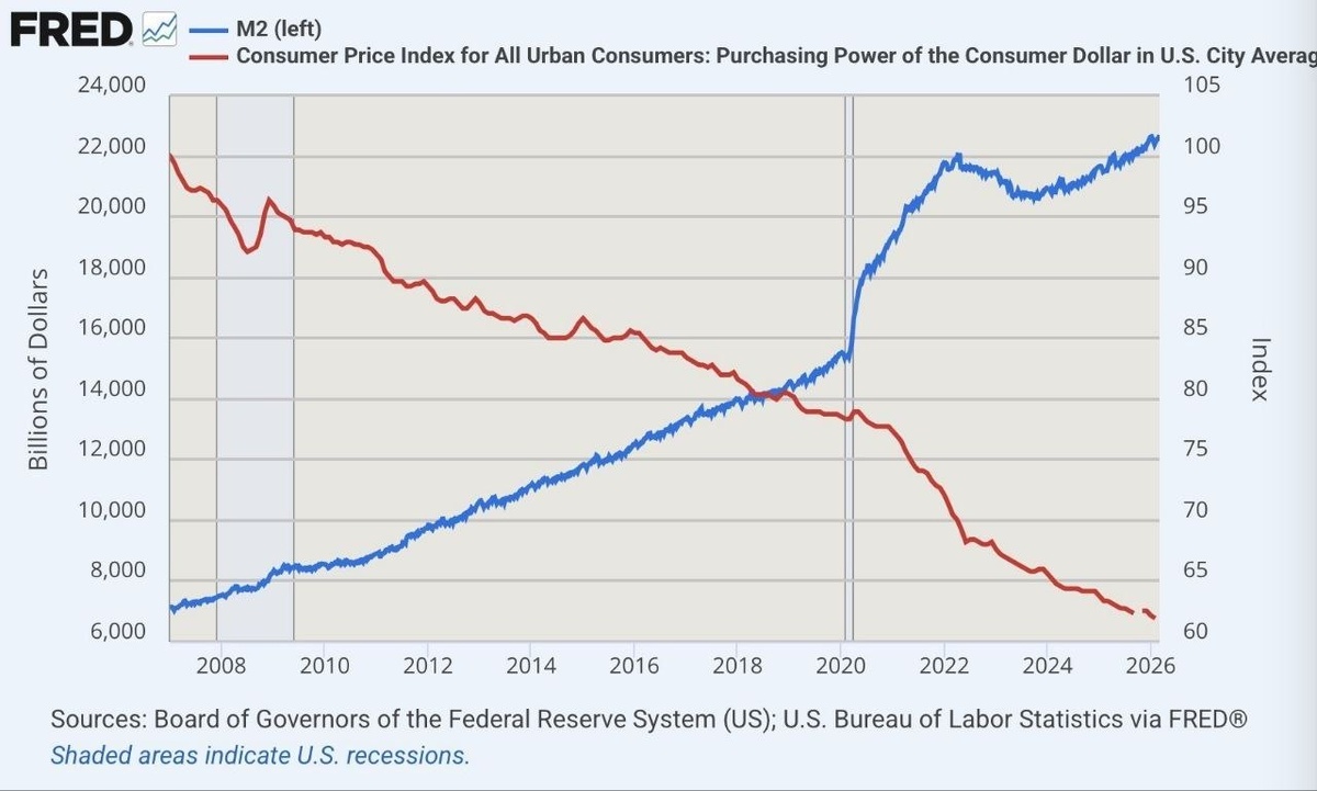 Денежная масса доллара утроилась с 2008 года, а валюта потеряла 38% своей покупательной способности. *** Денежная масса растёт... Ну а ценность соответственно падает. @invest_by