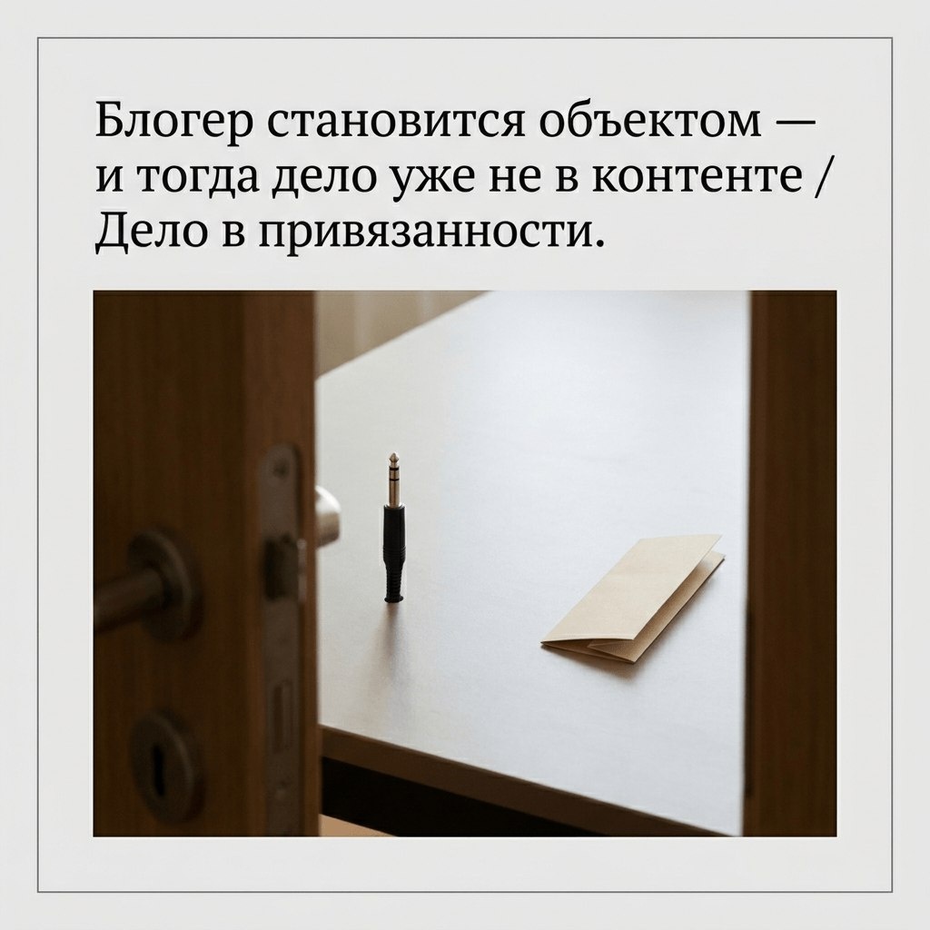 И это не про вкус. Это про объект. Блогер перестаёт быть внешней фигурой. Он становится вложенным. С ним связывается опыт. Через него переживается своё. Он занимает место внутри. И тогда любая критика звучит иначе. Это уже не «мне не нравится он». Это «мне не нравится то, с чем ты связан». И включается защита. Не мнения. Привязанности. Потому что объект уже не снаружи. Он свой. И тогда спор ломается. Не на аргументах. А на месте связи. И становится ясно: разговор шёл не о блогере. А о том, что внутри с ним связано. ©Элеонора Красилова • TG ©Элеонора Красилова • MAX