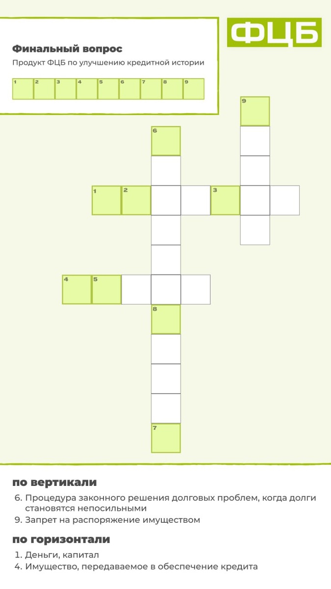 Знаете этот момент, когда банки говорят «скоринг», «БКИ», «рейтинг», а ты просто хочешь узнать — дадут кредит или нет? 🤯 Мы решили: хватит страданий. Давайте поиграем! 🕵️♂️ Перед вами кроссворд на тему кредитов, долгов и банкротства. Разгадаете все слова — а из выделенных жёлтым клеток соберётся секретное слово. Оно связано с продуктом ФЦБ, который возвращает доступ к деньгам. 🎁 Подсказка: секретное слово из 9 букв. Кто угадает первым — тому респект и виртуальный кредитный рейтинг 999 😎 Хотите еще подсказку? Переходите на сайт https://vk.cc/cVA9bb А если ваша реальная кредитная история хромает — не гадайте. Напишите «КРОССВОРД» в сообщения, и мы бесплатно проверим, что с ней не так.