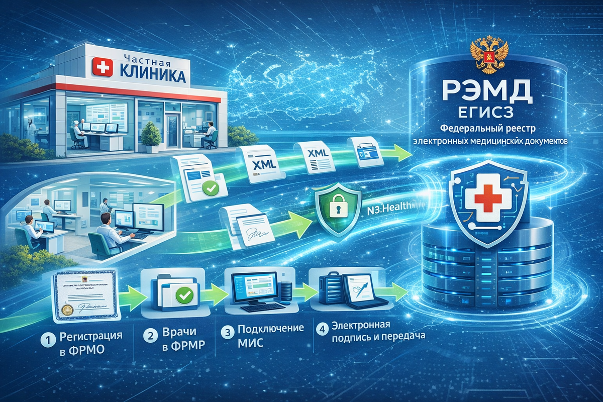 - Для частных клиник прямое подключение к ЕГИСЗ технически сложное (требует аттестации ФСТЭК, криптошлюза VipNet/CryptoPro и регистрации как оператора ПД).