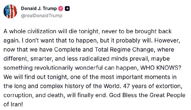 ❗️Дональд Трамп: Целая цивилизация может погибнуть уже этой ночью и никогда больше не вернуться