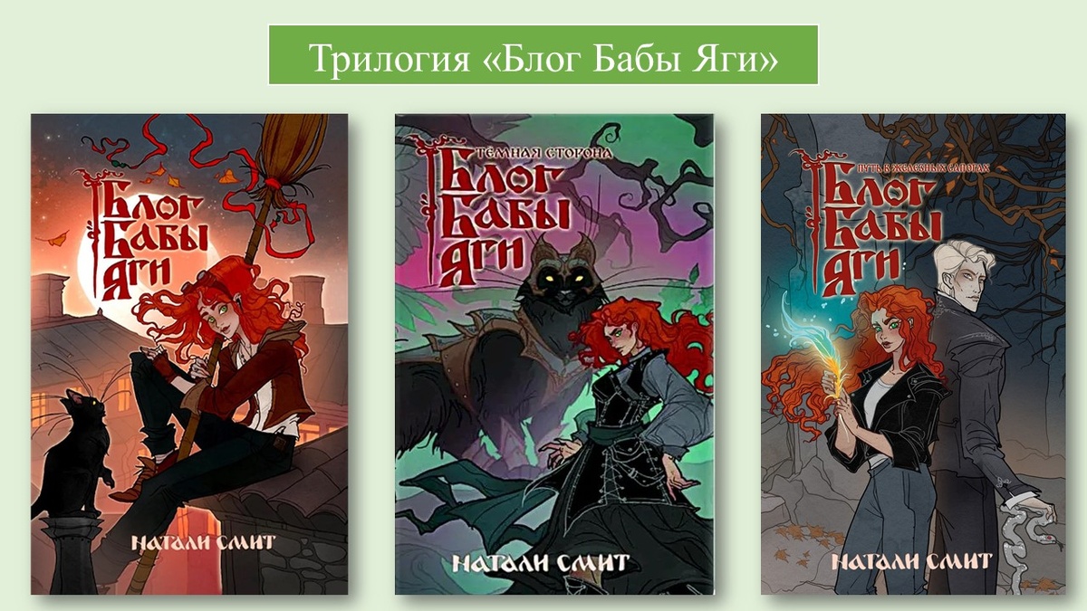 Серия книг Натали Смит «Блог Бабы Яги» – это детективное фэнтези, в котором переплетаются русские народные сказки и современные реалии. Автор предлагает свежий взгляд на знакомых с детства образы, помещая их в необычные обстоятельства и добавляя нотку иронии. Первая книга: «Блог Бабы Яги» История начинается с авантюры: обычная девушка Янина, ищущая работу, откликается на странное объявление аниматора-Бабы Яги. Обещания высокой зарплаты и бесплатного жилья оборачиваются магическим контрактом, из которого невозможно выйти, и настоящей службой в сказочном мире Лукоморья. Здесь магия соседствует с бюрократией, а классические персонажи раскрываются с неожиданных сторон. Интересный ход – ведение блога, который постепенно уходит на второй план, уступая место захватывающим приключениям. Вторая книга: «Блог Бабы Яги – 2. Тёмная сторона» Сюжет становится глубже и драматичнее. Янина и её верный спутник, кот Бальтазар, продолжают исследовать миры Яви и Нави. На первый план выходят вечные темы друж