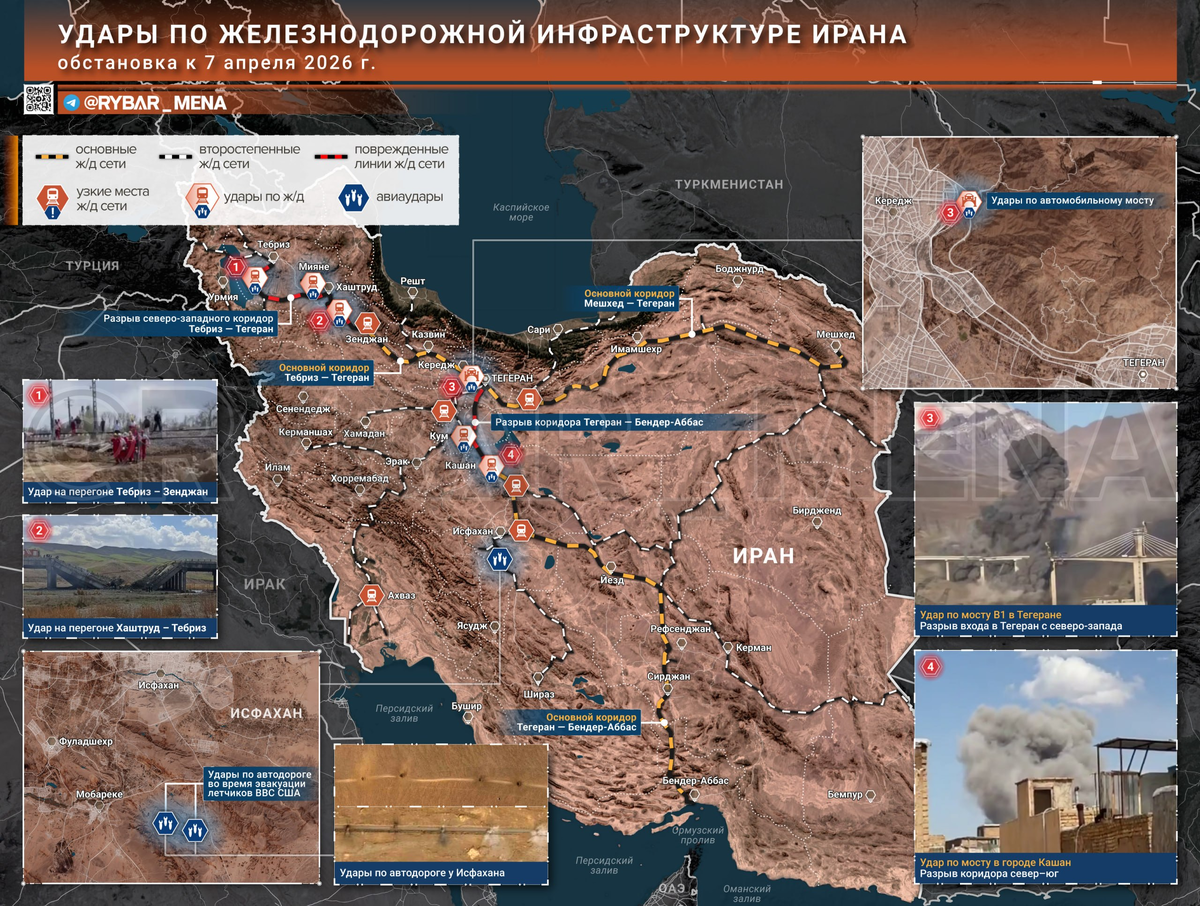 Иран подвергся ударам по ключевым ж/д путям — выбиты около 10 участков путей и мостов. Под удар попали направления Миане — Хаштруд — Тебриз — Зенджан и участок Кашан — Кередж. Речь идёт о разрыве сразу нескольких ключевых коридоров: северо-западного (через Тебриз) и оси север–юг через Тегеран. Отдельно выбит мост B1 на северо-западном входе в столицу, а также мост южнее Кашана — ещё одна точка, через которую держится движение на Исфахан и дальше к портам. Такие удары — один из самых явных признаков приближения наземной операции. Перед заходом на землю в первую очередь режут логистику, чтобы лишить возможности быстро перебрасывать силы. 🚩Показательный момент — район Исфахана. Там ранее уже били по автодороге во время американской поисково-спасательной операции, чтобы осложнить движение КСИР. Сейчас логика та же, только с поправкой на более глобальные цели. ❗️Ключевой момент — мосты. При ограниченной связности сети они превращаются в узкие места: выбивание нескольких точек — и движение