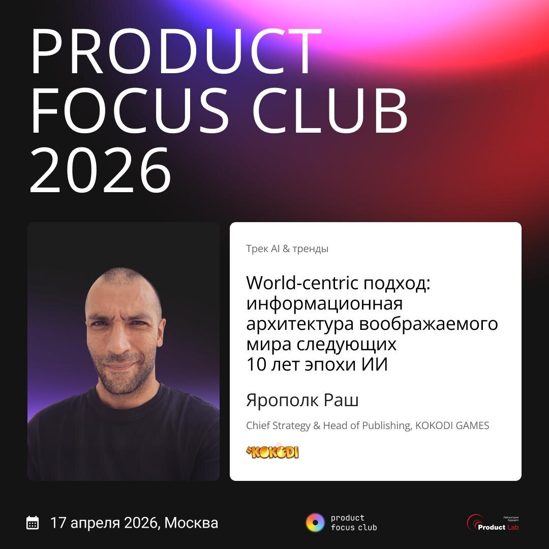 Гораздо важнее вопроса «Куда нажмет на экране пользователь?» в gamedev другое: что человек почувствует при взаимодействии с продуктом, захочет ли вернуться завтра. Продуктовым командам на других рынках часто было достаточно метрик, CJM, воронок, фич. Но благодаря распространению AI пользователь больше не взаимодействует с интерфейсом как раньше. Он не «ходит по экрану». Он общается, делегирует, получает результат. Контент, сервисы и UX начинают сливаться в единое пространство. На первый план выходит то, какую реальность вы создаете вокруг человека в своем продукте. Скоро продактам нужно будет думать категориями «как сформировать среду», а не стандартными продуктовыми метриками. 🟣 На Product Focus Club 2026 об этом расскажет Ярополк Раш — Chief Strategy & Head of Publishing, KOKODI GAMES. В докладе: • как выглядит инфраструктура информации (контент, сервисы, UX) следующих 10 лет; • как проектировать, запускать и растить world-centric продукты; • какие компетенции нужны командам, чт