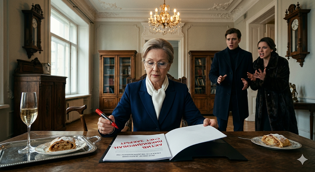 Она медленно подняла глаза на внука. Максим нервно отбивал ритм ботинком по паркету. В его взгляде не читалось ни тени смущения — лишь раздражающее ожидание и циничный расчет.