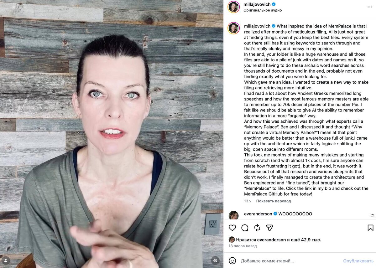 Актриса выложила на GitHub тулзу для улучшения памяти ИИ-агентов - MemPalace, который разработала вместе с другом👀