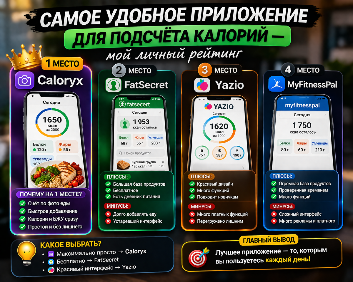 👉 чем проще и быстрее — тем выше в списке. Самое удобное приложение, если не хочется заморачиваться. 👉 Подходит, если: Хорошее бесплатное приложение. Красивое и популярное приложение. Классика среди приложений. Просто ориентир: Самое удобное приложение — то, которым вы пользуетесь каждый день. Если приложение: вы просто перестанете считать калории. Поэтому лучше выбрать простоту и скорость, чем «идеальный функционал».