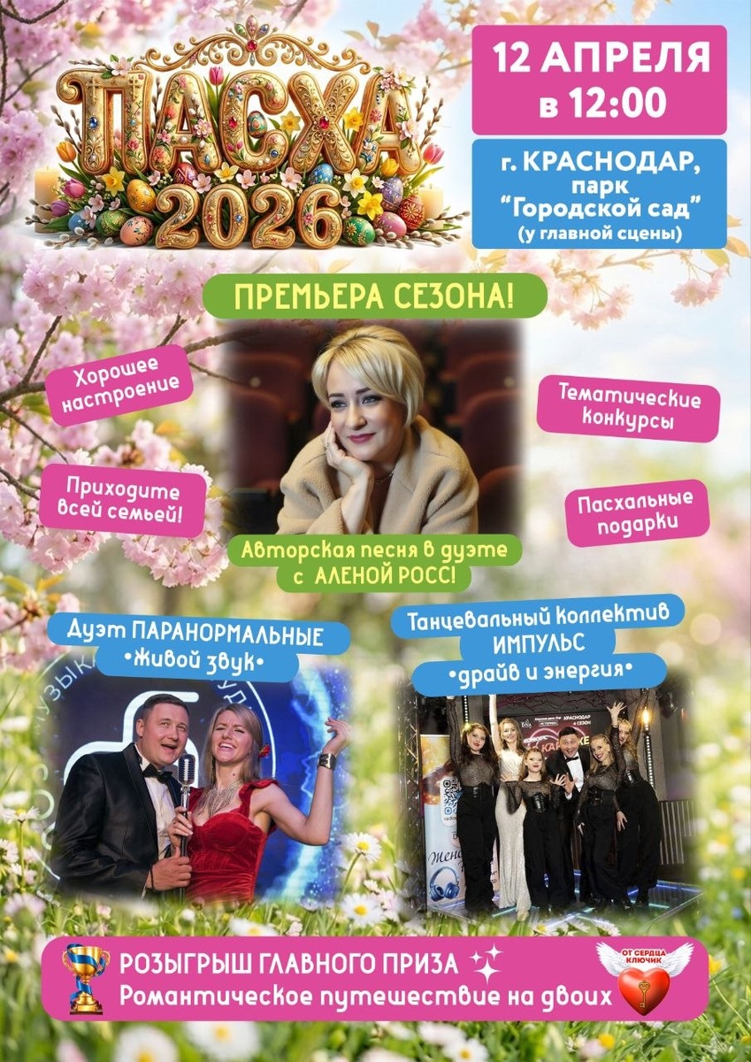 🫶🤗 🥚 #ПАСХА 2026 🥚 📍 г. Краснодар, Городской сад (у главной сцены) 📅 12 апреля | ⏰ 12:00 🌟 Вас ждет праздничная программа: 🎉 ЗАЖИГАТЕЛЬНОЕ #ШОУ ▪️ #Дуэт ПАРАНОРМАЛЬНЫЕ — живой звук ▪️ Танцевальный коллектив ИМПУЛЬС — драйв и энергия 🎶 #ПРЕМЬЕРА СЕЗОНА! Авторская песня в дуэте с популярной певицей АЛЁНОЙ РОСС! 🏆 #РОЗЫГРЫШ ГЛАВНОГО ПРИЗА ✨ Романтическое путешествие на двоих ✨ ➕ Тематические #конкурсы, хорошее настроение и пасхальные подарки! Приходите всей семьей! 🕊️