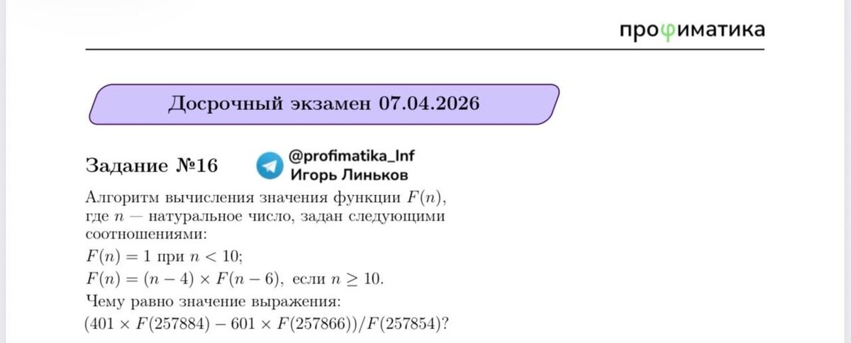 🚨 Итак, я получил условия реальной задачи №16 и сразу же записал для вас разбор! Смотреть советую ВСЕМ, задачка удивила даже меня, думаю, что на реальном ЕГЭ повалились бы многие Хочу напомнить, что вы еще можете присоединиться к «Методу Антискипа», на котором как раз-таки прорешиваем все прототипы заданий и учимся мыслить нестандартно (потому что новые типы встречаются каждый год) А пока предлагаю вам свое решение этой задачки: 📱YouTube 📱TikTok