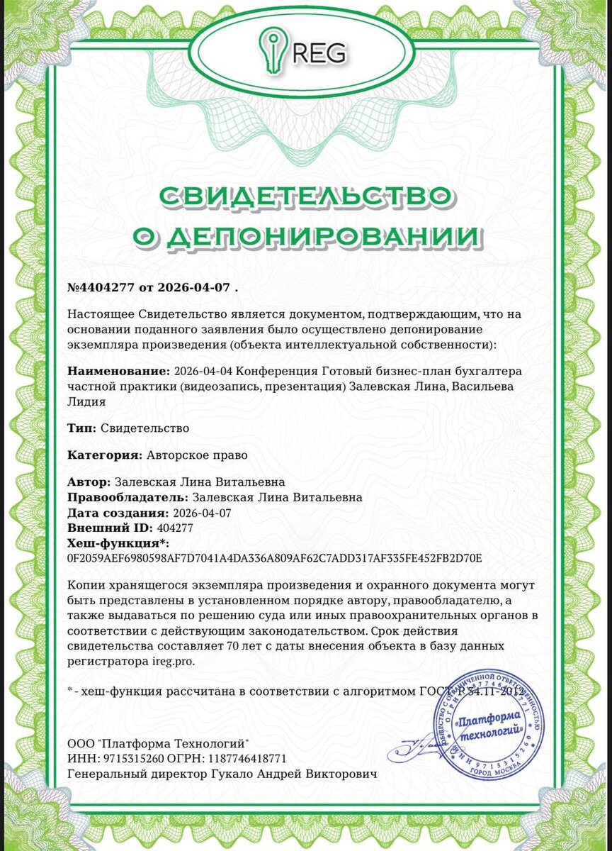 Рассказываем, почему задерживаемся Коллеги, знаем, вы ждёте запись конференции. Но прежде чем выложить, нам нужно кое-что сделать. И нет, мы не потеряли файл и не забыли пароль от облака 😅 То, о чём мы говорили 4 апреля — «Система частной практики бухгалтера», элементы этой системы, разложенные по этапам — это наша авторская разработка. Мы первые, кто собрал всё это в единую концепцию и назвал своими именами. До нас этого не было. Как не было когда-то и самого понятия разграничения зоны ответственности бухгалтера, его мы тоже ввели, в прошлом году. Теперь идём дальше: депонируем элементы системы и стандарты бухгалтера в частной практике. Мы знаем цену своей работе. И хотим, чтобы она осталась нашей — а не всплыла завтра в чужом вебинаре под чужим именем с пометкой «авторская методика» 🙈 Поэтому перед публикацией мы депонируем материалы. Кстати свидетельства на наши Стандарты уже получены, а значит все, кто использует названия, элементы, названия блоков (не говоря уже о наполнении