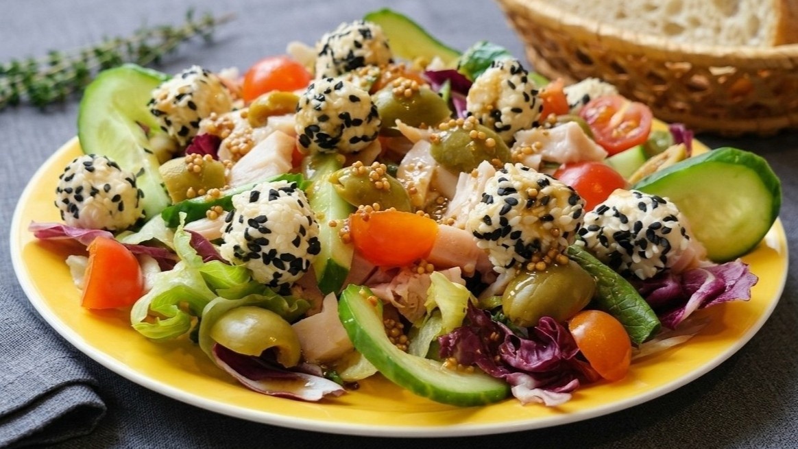 Раньше нерезала сыр кубиками или просто ломала мягкий адыгейский., заправляла чаще маслом с лимоном. Получалось вкусно, привычно. А потом попробовала иначе, и тот же набор продуктов стал выглядеть нарядно на тарелке. Главное, не нужно ничего жарить и варить. Копчёная курица, свежие овощи, сырные шарики и заправка. Собрали, полили, подаём. Первый приём: творожно-сливочный сыр скатать в шарики и обвалять в смеси чёрного и белого кунжута. Второй: заправка с зернистой горчицей, добавляет и вкус, и красоту. Вместе они делают из простого салата блюдо, которое достойно смотрится на праздничном столе. Салатный микс — 100-120 г