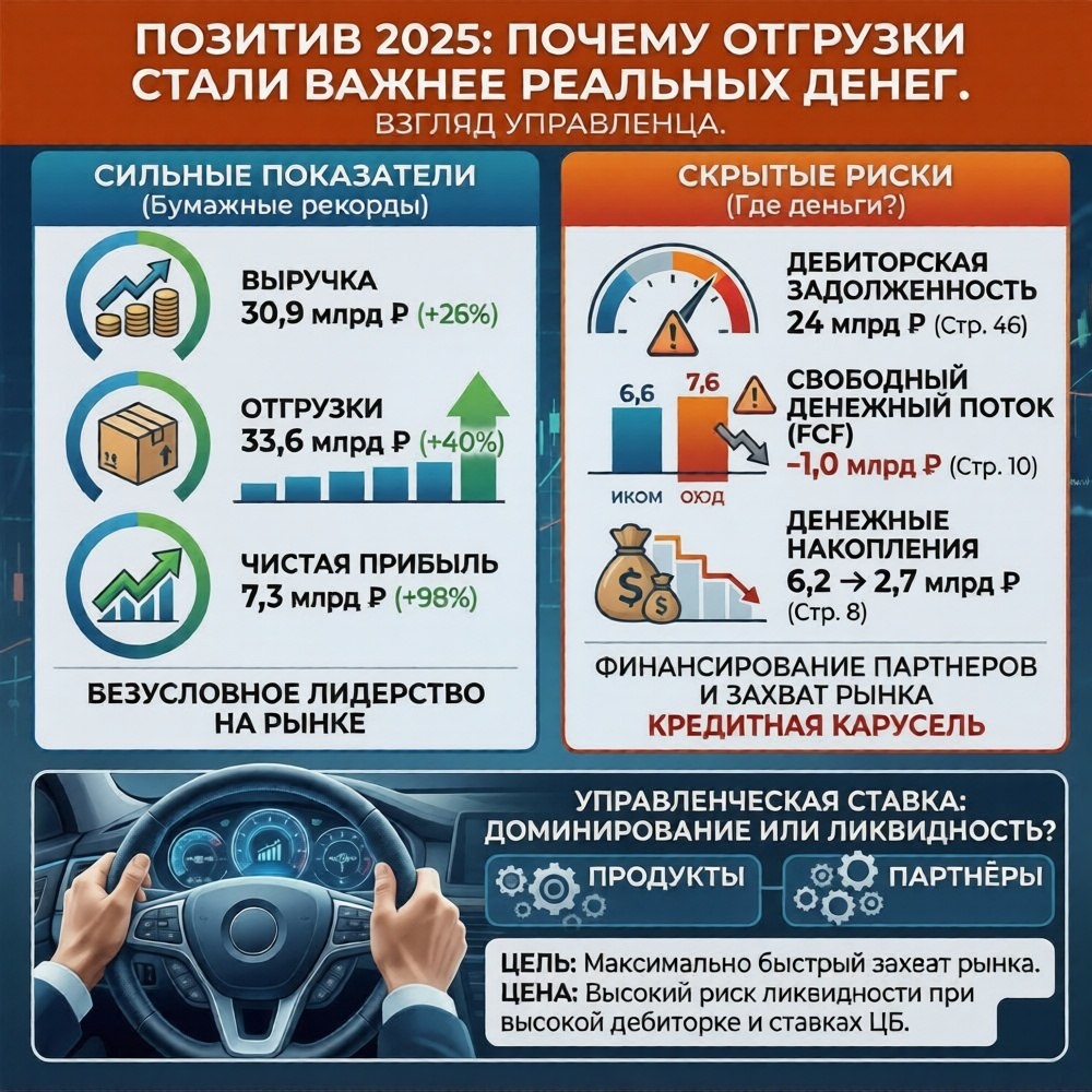 Почему отгрузок больше чем реальных денег. Посмотрел годовой отчет Positive Technologies глазами управленца. Оценил ситуацию через цифры. Дал ссылки на финансовые термины прямо по тексту. Цифры выглядят сильно. Выручка 30,9 млрд рублей, отгрузки 33,6 млрд, чистая прибыль выросла почти в два раза. Это безусловное лидерство. Но за рекордами стоит интересная механика. Отгрузки это полная стоимость договоров, которые сейлзы подписали и передали партнерам. Выручка -- это только та часть суммы, которую бухгалтер имеет право признать доходом в 2025 году. Например, если вы продали техподдержку на три года вперед, в "отгрузки" она упадет целиком прямо сейчас. Но в "выручку" 2025 года бухгалтер запишет только оплату за месяцы этого года, а остальное будет учитывать постепенно в будущем. Компания фактически финансирует рост через канал Дебиторская задолженность достигла 24 млрд рублей (см. стр. 46). Это значит, что лицензии отгружены, а реальные деньги в компанию еще не зашли. На 10-й страниц