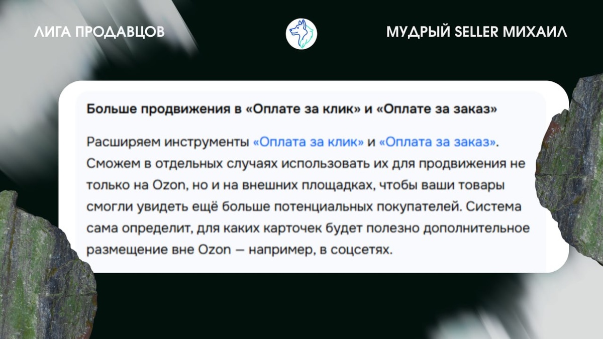 " ‼️ Теперь инструменты "Оплата за клик" и "Оплата за заказ" смогут продвигать товары на внешних площадках — например, в соцсетях. Система сама выберет подходящие карточки. Это сработает в "Оплате за заказ" для выбранных товаров и в "Оплате за клик" при стратегии "средняя стоимость клика" в поиске и рекомендациях. Механика, цены и условия те же — платите только за клики или заказы. 🔔 Появляется новый источник трафика, и кажется, что это хорошо, но Ozon, как всегда, не отдаст статистику по нему — так же, как не дают по свайпам. В кабинетах увидим просто рост просмотров, кликов и ДРР. Это намёк перейти с "средней стоимости клика" на автостратегию? Посмотрим, как отразится на продажах. Если надо будет, перейдем и на автостратегию. ⬇️ Что думаете, коллеги? 📱 ПОДПИСАТЬСЯ в Telegram 📱 Подписаться ВК ⚡️Читать в SellerMap Консультация Мудрого|Юнитка Ozon|Закрытый-чат продавцов