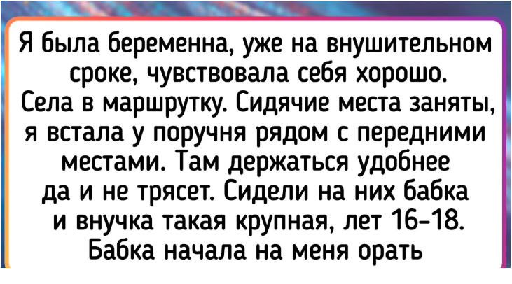 Я была беременна, уже на внушительном сроке, чувствовала себя хорошо. Села в маршрутку. Сидячие места заняты, я встала у поручня рядом с передними местами. Там держаться удобнее да и не трясет. Сидели на них бабка и внучка такая крупная, лет 16–18. Бабка начала на меня орать, чтобы я не смела психологически давить на ребенка. Мол, они все равно не уступят, а я не имею права над ними стоять и шла бы я в конец салона. Но ор бабки произвел обратный эффект: какой-то мужчина встал и уступил мне место. Бабка после этого еще долго ворчала что-то под нос. © Melissa / ADME