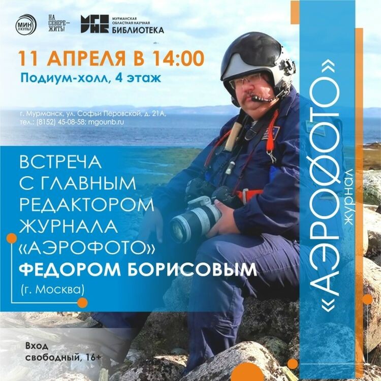 Мурманская областная научная библиотека приглашает жителей и гостей города на открытую встречу с главным редактором журнала «АЭРОФОТО» Федором Борисовым. Мероприятие состоится 11 апреля в 14.00 в «Подиум-холле» на 4-м этаже учреждения. Встреча пройдет в формате диалога, посвященного профессиональным вопросам фототворчества. Федор Борисов, также возглавляющий фотоагентство «ТранспортФото», расскажет о технических нюансах съемки, особенностях работы фотографа на Севере и реализации долгосрочных творческих проектов. Участники смогут обсудить развитие фотографического сообщества и задать вопросы о том, как начать карьеру в авиационной фотографии. Спикер представит журнал «АЭРОФОТО» - периодическое издание, объединяющее лучших авторов страны и представляющее собой уникальный мини-альбом работ, посвященных авиации. Вход свободный. Афиша: Мурманская областная научная библиотека. «Мурманский вестник» в МАХ.