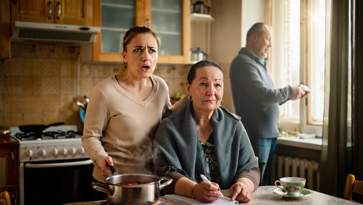 Ирина кивнула сама себе. Встала. Подошла к плите. Выключила борщ. Потом повернулась и посмотрела на них обоих — на свекровь в её пуховом платке и мужа с его виноватой плешью.