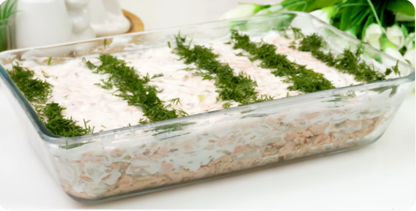 Сверху должна быть рыба, смазываем майонезом. И убираем пропитаться в холодильник на часа 4-5 или на ночь. Если нет времени ждать, можно все перемешать и сразу подавать к столу. Полностью Согласна с автором рецепта 👉 получается настолько вкусно, что будут есть ВСЕ, и те кто любит рыбу, и те кто рыбу вовсе не ест...