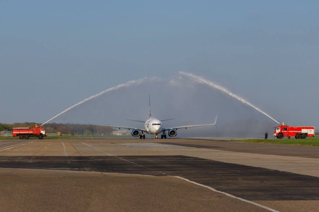Самолет нового перевозчика в Шарм-эль-Шейх встретили водной аркой в Краснодаре