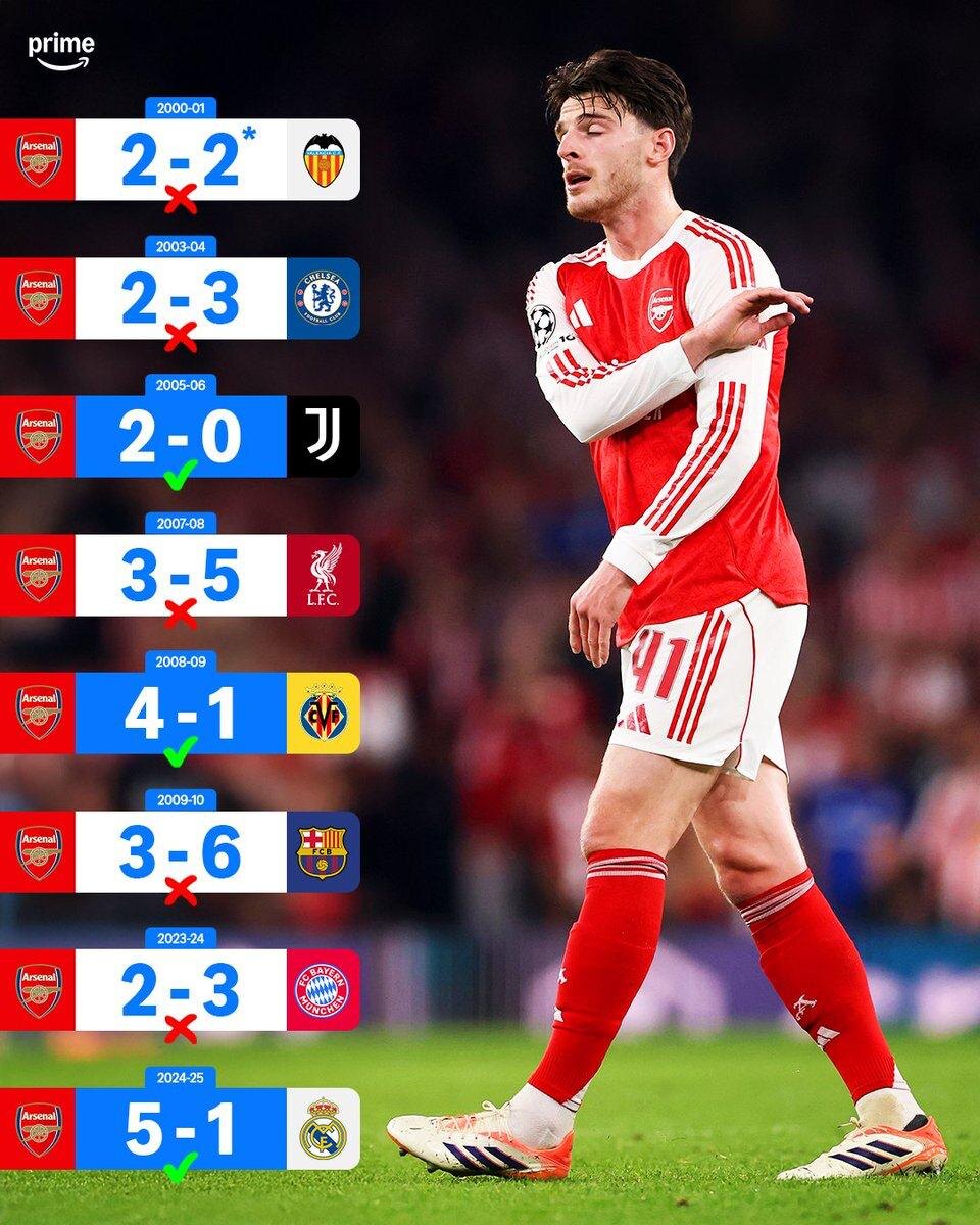 "Арсенал" выиграл только три из восьми своих четвертьфинальных противостояний в Лиге Чемпионов, но в прошлом году выбил "Реал" 🏆