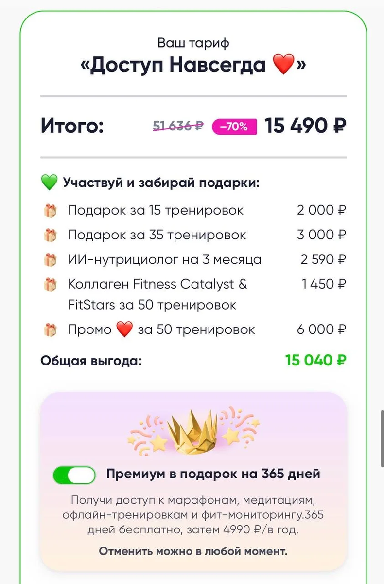 Я думала, что в марте будут самые-самые крутые условия подписки... Как же я ошибалась! И верите, по-хорошему завидую тем, кто сейчас оформит подписку. Ведь мне, чтобы получить все плюшки, которые предлагаются вам в качестве бесплатного подарка, нужно Премиум покупать за полную стоимость.... Эхх... И чего я так рано подписалась... ))) Итак, обо всем по порядку. Апрель — ваш шанс при оформлении «Доступа навсегда» получить ГОД бесплатных обновлений FitStars в подарок! Только до конца апреля активируйте подписку премиум — и целый год без забот: все обновления уже включены. Тут и новые программы каждые четыре недели, и доступ ко всем марафонам, в том числе и прошедшим, и медитации, чтобы привести душу и голову в порядок, обрести гармонию и спокойствие. С мая подарок сократится до 1 месяца — не упустите самый выгодный вариант! Внимание: специальное предложение действует только в апреле! А также, с 1 по 30 апреля купи «Доступ навсегда» — и получай еще персональный подарок за тренировки: 15 т