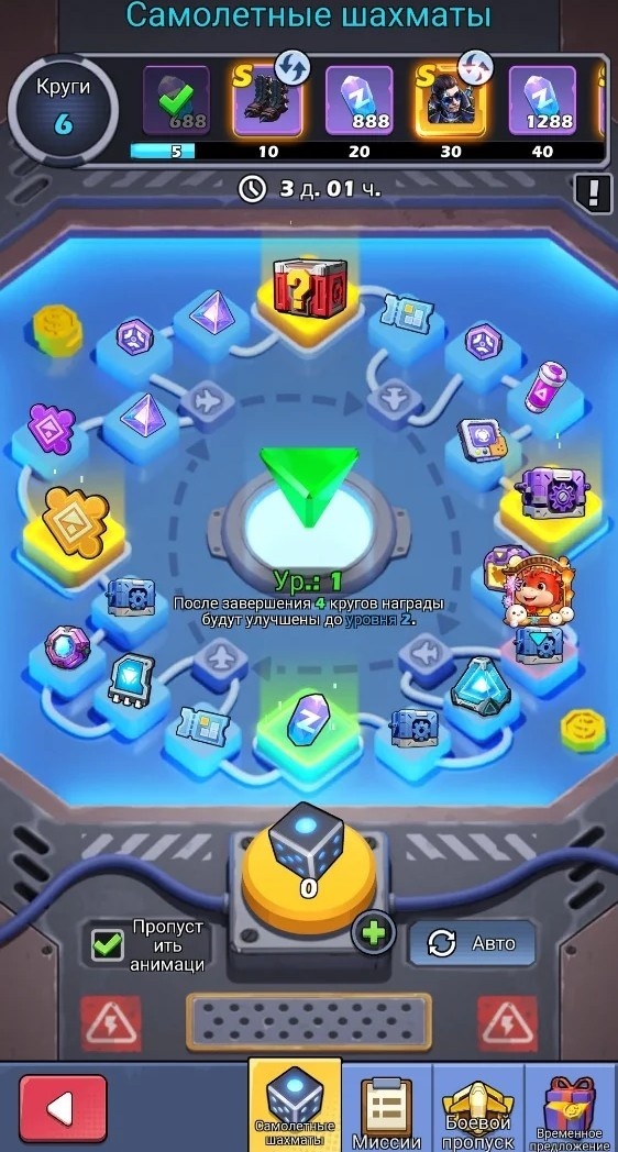 Ивент проходит очень редко, точное расписании не скажу, возможно всего 2 раза в год. Кто знает, подскажите, исправлю и уточню. Событие идёт неделю, с понедельника по воскресенье и даёт возможность играть на кристаллы. То есть кристаллы надо копить, правило №2 игры без доната! На самом деле к шахматам игра не имеет никакого отношения: Что то типа настольной игры с кубиками и фишками. Бросаете кубик и ходите по кругу фишкой. Фишкой является аватарка вашего героя. В процессе игры ава попадает на поля с призами, или на поля с самолётиком и тогда перелетает вперёд сразу на несколько полей. Призы по большому счёту ни о чём, только "Красный сундук" с чем то ценным. Что там не знаю, ни разу не открывал. А вот за пройденные круги вы получаете гарантированные призы: Круги считаются в верхней шкале прогресса. Призы выбираете сами, в пустых квадратиках, нажимая на значок со стрелками. Там очень много вариантов, и чем дальше по шкале, тем больше вариантов и дороже призы. Событие раньше было крайн