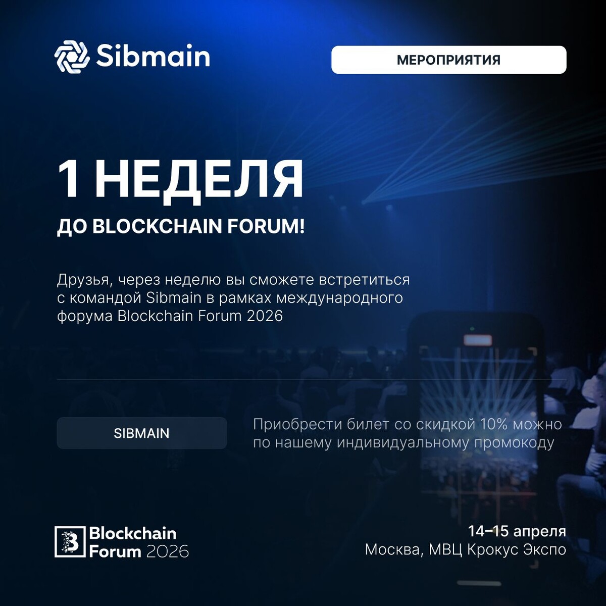 ! ➡️Друзья, через неделю вы сможете встретиться с командой Sibmain в рамках международного форума Blockchain Forum 2026. 🗓 Дата: 14–15 апреля 2026 года 📍 Место проведения: МВЦ Крокус Экспо, Москва, Международная улица, 16 В рамках форума запланированы: ⏺ Панельные дискуссии; ⏺ Нетворкинг с лидерами индустрии; ⏺ Выступления экспертов; ⏺ Глобальная выставка криптокомпаний Приобрести билеты со скидкой 10% можете по нашему индивидуальному промокоду SIBMAIN 📍До встречи на Blockchain Forum у стенда S1
