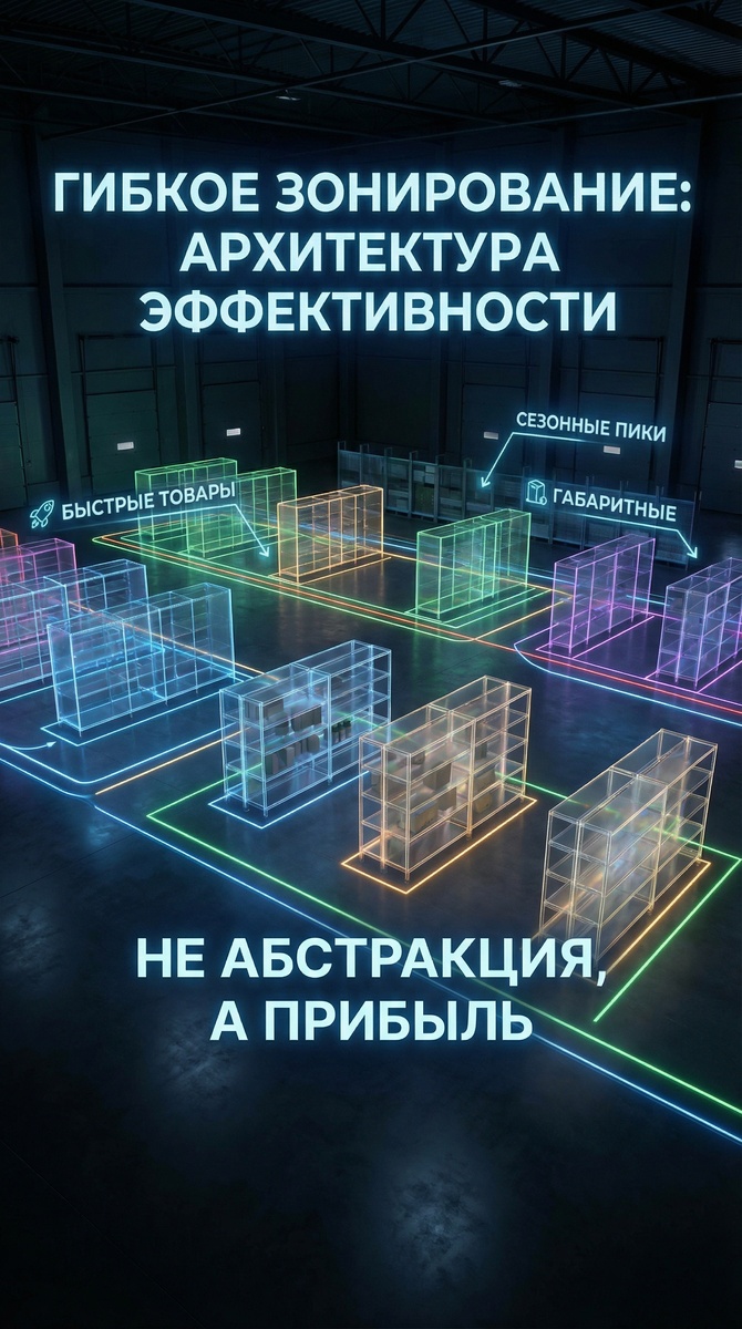 Смысл: «Зоны под твои товары» + «Гибкость в организации» Гибкое зонирование — это организация складского пространства по типам товаров, интенсивности оборота, особенностям обработки и сценариям нагрузки. То есть склад делится не “как получится”, а по функциональной логике: быстрооборачиваемые, паллетные, мелкоштучные, сезонные, хрупкие, габаритные, резервные, буферные и другие зоны. Advantage — в чём преимущество? Такая модель уменьшает лишние перемещения, упрощает маршруты, снижает конфликт между потоками и делает пространство адаптивным. При изменении ассортимента или роста объёма бизнес н