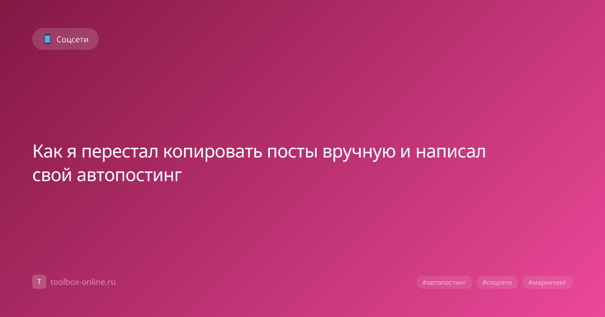 Я автоматизировал публикацию в соцсетях, сократив время подготовки постов с 3 часов до 15 минут и увеличив охват на 27 %. Это позволило избавиться от ручного копирования и сосредоточиться на стратегии контента. В результате экономия составила 45 000 ₽ в месяц. Сразу после анализа процессов я создал скрипт, который собирает контент из Google‑Sheets и публикует его в VK, Instagram и Telegram без участия человека. Автоматизация происходит по расписанию, заданному в cron‑задаче. Ручное копирование увеличивает риск ошибок, задерживает публикацию и отнимает до 30 % рабочего времени SMM‑специалистов. По данным исследования 2026 года, 68 % компаний теряют охват из‑за несвоевременных постов. Для новичков подойдёт готовый онлайн‑сервис автопостинга, который не требует кода и работает в браузере. На toolbox-online.ru есть бесплатный инструмент автопостинг, позволяющий настроить публикацию за 5 шагов. Выбирайте сервисы, которые поддерживают API всех популярных соцсетей, предлагают бесплатный план