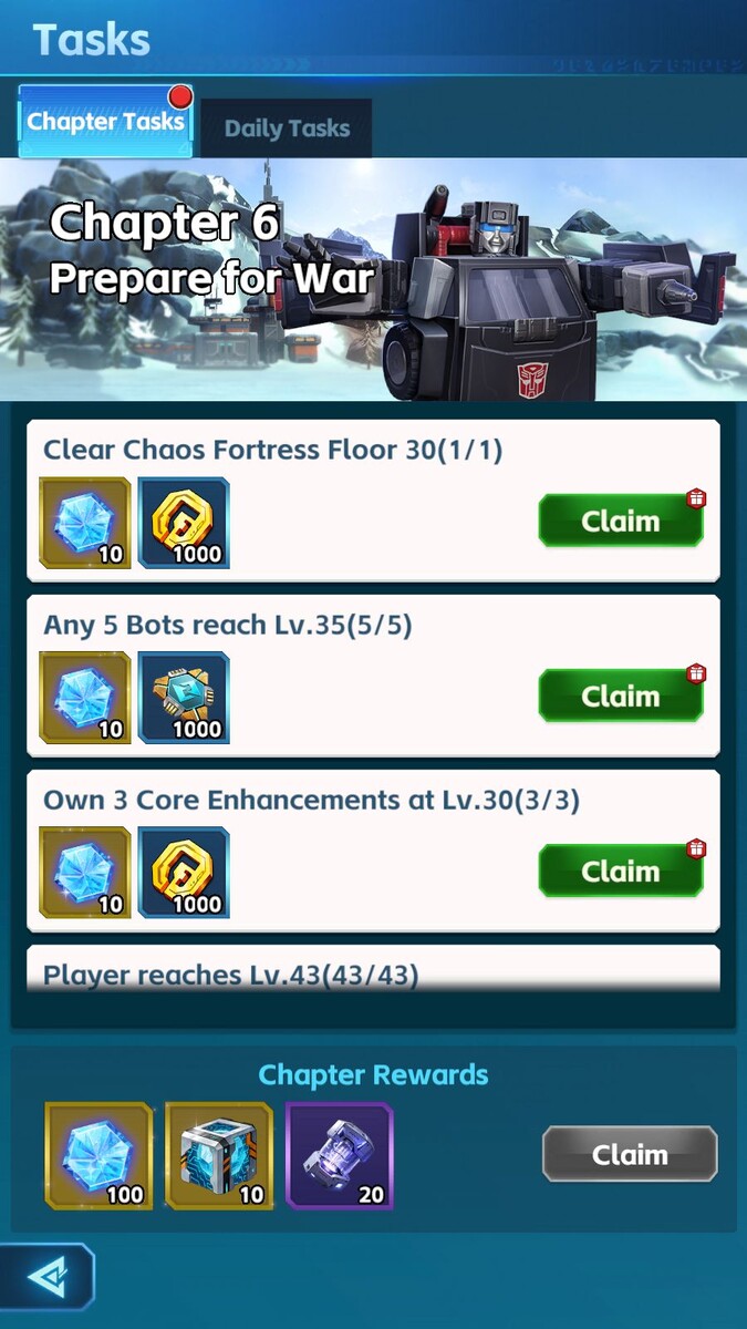 Начиная с главы 6 разработчики уже не стали заморачиваться и придумывать названия - все они зовутся "Prepare for War". Шестая глава продолжается до уровня 46, а на уровне 45 открываются сразу два игровых режима. Первый из них назван "Cryo-Tech Venture" и представляет собой блуждание по замороженной пещере в поисках модулей и ресурсов для их улучшения. Каждый модуль - это предмет усиления, ставящийся в один из 4 слотов бота (только в один определённый, соответствующий типу модуля).