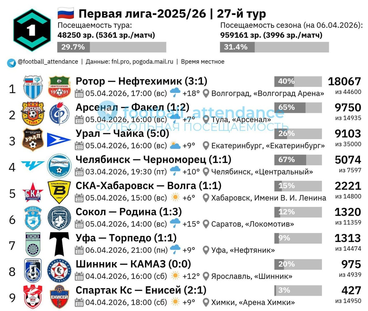 Завершившийся тур стал самым посещаемым в весенней части этого сезона (5361 зр./матч), а также самым посещаемым с середины сентября: тогда встречи 10-го тура в среднем собрали 5404 зр./матч. Аудитория игр 27-го тура была на 34% выше, чем средняя в сезоне (3996). Игра в Волгограде, собравшая максимальное число болельщиков в туре (18067), стала седьмой по числу зрителей в текущем сезоне лиги. 9750 болельщиков на игре «Арсенала» и «Факела» — это максимум для Тулы более чем за пять лет! До воскресной игры рекордным в пост-ковидный период был матч с ЦСКА в 22-м туре РПЛ-2020/21 13 марта 2021 года (9890). Важно отметить и новый рекорд для «выездов» текущего сезона — по данным протокола матча, 1794 фаната «Факела» присутствовало на гостевом секторе стадиона «Арсенал». По неофициальным данным – до 2.5 тысяч (с рекордом за всю историю Первой лиги/ФНЛ). Предыдущий рекорд этого сезона также за «огнеопасными» — 1540 фанатов на выезде в Волгограде. После возвращения на основной стадион из манежа «У
