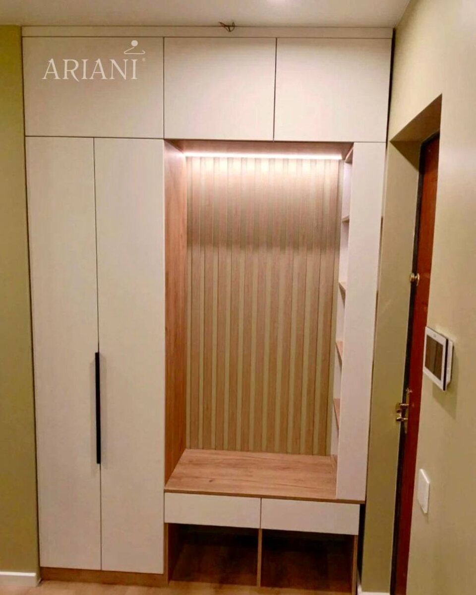Узкий коридор. С одной стороны двери, с другой стена, где вроде бы «что-то можно поставить»… но если поставить — уже не пройти. И вот в таких планировках чаще всего и возникает главный вопрос: куда вообще убирать вещи? Потому что прихожая нужна. Шкаф нужен, а места нет. В этом проекте ситуация была ровно такой. Проход узкий, пространство вытянутое, и любая ошибка, сразу ощущение тесноты. Решение наша команда нашла не в «одном шкафе на всё», а разделили задачу на две части. Сначала спроектировали саму прихожую. Та самая зона, куда заходишь каждый день. Размеры: Д1523 × В2440 × Г.502 мм. Сделали компактно, но функционально: ⏺️есть место присесть, ⏺️открытая зона, чтобы быстро повесить вещи, ⏺️ящики и ниши для мелочей. И важный момент, конечно, свет. Подсветка внутри сразу убирает ощущение «тёмного угла» и делает пространство живым. По материалам пошли в спокойную светлую гамму: фасады МДФ в плёнке Силк Айсберг — чисто, легко, без перегруза. Внутри — ЛДСП «Вяз либерти светлый» — доба