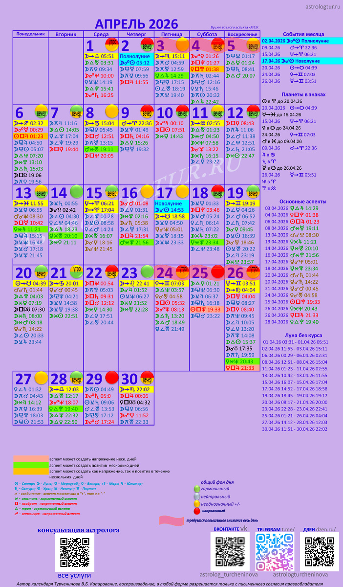 В астрологическом календаре приведены основные аспекты на каждый день, с указанием точного времени (мск) каждого такого аспекта, что очень удобно, для того, чтобы понять сколько по времени будет действовать аспект. Иногда в один день есть и напряженные аспекты, и гармоничные.