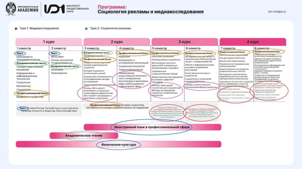 Давайте разберемся, как «читать учебный план», на примере программы «Социология рекламы и медиаисследования». На страницах наших программ опубликованы как адаптированные учебные планы, так и полные подробные таблицы.
