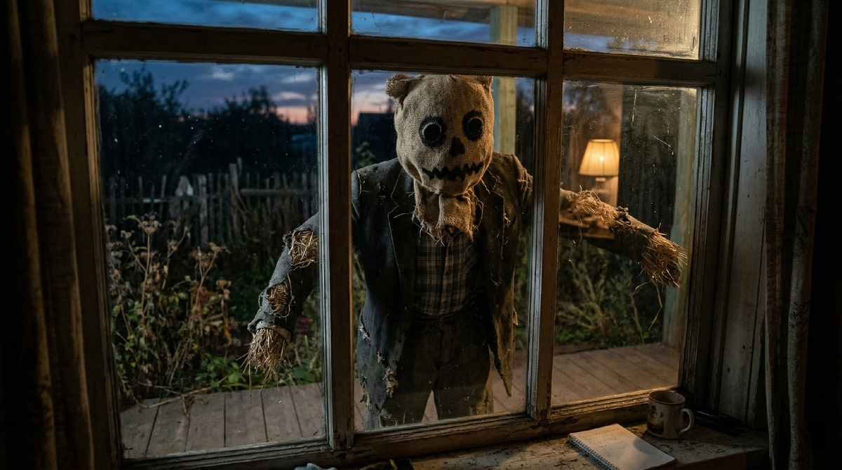 Август в этих краях пахнет одинаково — переспелой травой, дорожной пылью и чем-то неуловимо сладким, напоминающим запах тлена. Я приехал сюда, в глухую деревню на три двора, чтобы в полном одиночестве закончить проект. Место идеальное: мобильная связь ловит только на крыльце, а до ближайшего жилого поселка — пятнадцать километров по разбитой грунтовке, которую за лето окончательно поглотил лес. Проблема обнаружилась на второй день. Я вышел на крыльцо с чашкой кофе и привычно обвел взглядом огород, заросший лебедой и сухими подсолнухами. В самом центре, среди пожелтевших стеблей, стояло чучело. Я не помнил его вчера. Старая палка, вбитая в землю, перекладина вместо плеч, драный пиджак неопределенного цвета и голова из плотной мешковины, набитая прелой соломой. Лицо было нарисовано чем-то темным: два неровных круга вместо глаз и длинная, кривая прорезь рта. Оно стояло метрах в тридцати от дома. Я списал это на свою невнимательность. Но когда через час я снова выглянул в окно кухни, чашка