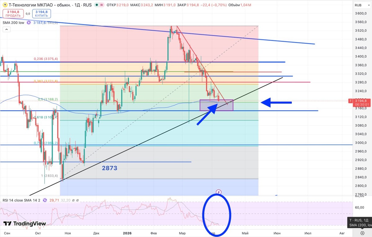 🤔 Тут сходятся и уровень по Фибоначчи, и 200-дневная средняя, и по RSI видна перепроданность... В целом, хватает технических факторов за то, чтобы где-то тут в указанной зоне разворачиваться 🤞 Фундаментально в бумаге всё отлично. Тем более в июне и июле будет парочка дивидендов 45 рублей и 46 (прогнозно за 1 квартал), что в сумме даёт 91 рубль возврата. Получаем, что бумага торгуется по 3100 без дивидендов. Считаю, что однозначно интересно для долгосроных инвесторов 🤓 Но это не значит, что не укатают ниже, особенно, если продажи носят не рыночный характер, о чём мы, если и узнаем, то только постфактум 🤷♂️