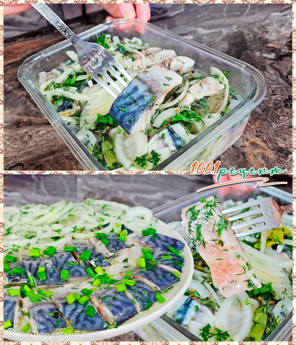 Готовится очень легко и просто, получается восхитительная слабосоленая рыбка с с хрустящим луком. Маринад варить не нужно - рыба готовится холодным способом. С отварной картошечкой и зеленью - идеально к ужину! 🔸Скумбрия свежемороженая 2-3 рыбки (вес рыбы с головой около 1.2 кг) 🔸Лук репчатый 2 шт. 🔸Укроп, петрушка 50 г 🔸Вода 200 мл 🔸Уксус яблочный 6% 50 мл 🔸Масло растительное 80 мл 🔸Сахар 1 ст. л. без горки 🔸Соль 1 ст. л. с горкой (25-30 г) 🔸Лавровый лист 5 шт. 🔸Перец черный горошек 1 ч. л. 🔸Кориандр в зернах 1 ч. л. 1️⃣Скумбрию оттаиваем, но не полностью. Слегка подмороженную рыбу разделываем на филе. Удаляем голову и хвост, делаем надрез вдоль хребта и аккуратно разделяем рыбу на 2 филе, удалив хребет и внутренности. Филе рыбы промываем под проточной водой. 2️⃣Подготовленное филе скумбрии разрезаем на порционные кусочки. 3️⃣Репчатый лук нарезаем полукольцами. 4️⃣Измельчаем зелень. 5️⃣В отдельной посуде смешиваем кипяченую воду комнатной температуры, уксус, соль и саха