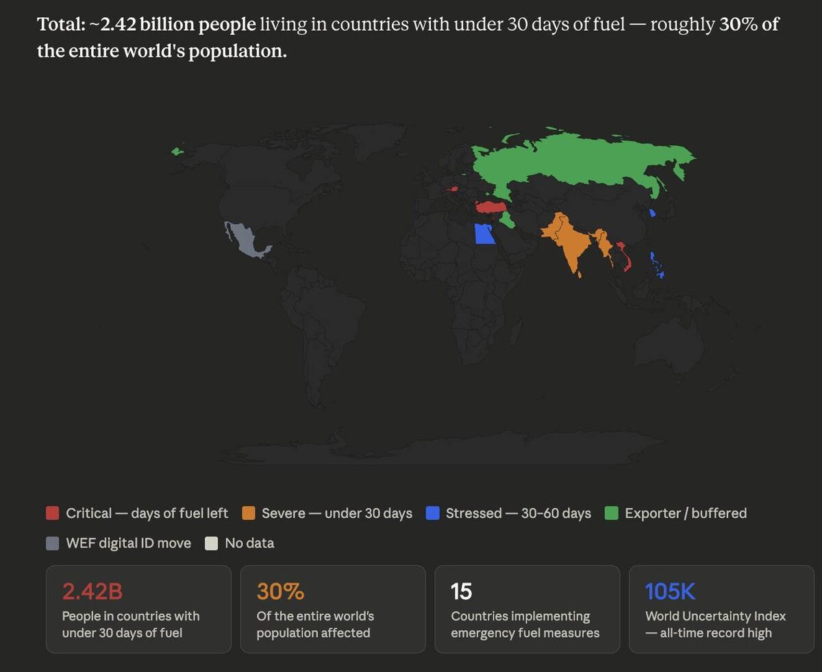 ЭТО НЕ КРИЗИС — ЭТО СИСТЕМНЫЙ СБОЙ Инвесторы, давайте уберём эмоции и разберёмся по фактам. Сейчас в инфополе активно разгоняется тезис: миллиарды людей окажутся без топлива уже к концу месяца. И если смотреть на отдельные цифры по резервам — звучит пугающе: Индия — ~10 дней стратегических запасов Австралия — ~29 дней Пакистан — ~20 дней Вьетнам — <20 дней Бангладеш, Ливан, Мьянма — вообще «считанные дни» На этом фоне появляются разговоры про нормирование топлива, ограничения, «энергетические локдауны». Но здесь важно включить холодную голову. Стратегические резервы — это не «последняя канистра бензина». Это буфер, который постоянно пополняется через импорт и логистику. Проблема не в том, что топливо закончится. Проблема в том, что система доставки начинает давать сбои. И вот это уже другой уровень риска. Мы уже видим: — геополитические конфликты вокруг логистических узлов — давление на поставки нефти и газа — рост стоимости перевозок — ограничения на экспорт удобрений и прод