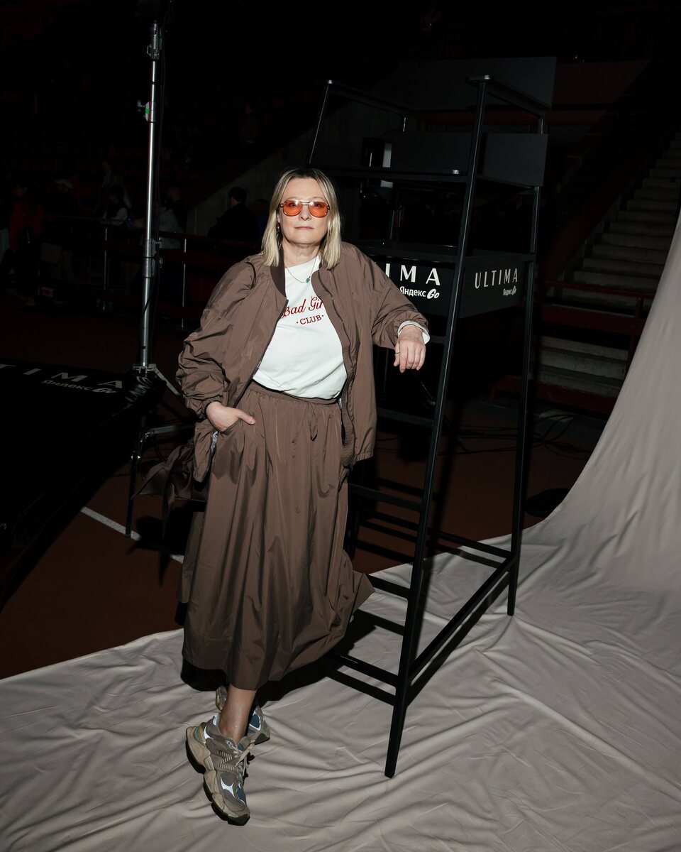 Бомбер и юбку из тонкой плащевой ткани в кофейном оттенке Маша выбрала для игры модного показа на манеже спортивного комплекса ЦСКА, где дресс-код спорт-шик получил дивное прочтение 💔
