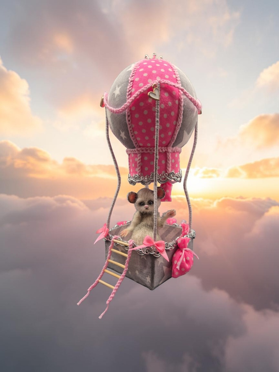 *. Открываю — а там… воздушный шар. Розово-серый, весь такой гламурный, с лестницей, утяжелителями и видом «я вообще-то на важной миссии» 🤍 А в корзине — она 💕 Маленькая. Шесть сантиметров дерзости. Без куртки. Без очков. Но с таким взглядом, будто она уже трижды облетела мир и дважды разочаровалась в людях 💔 — Вы кто? — спрашиваю. — Дусенька Небоедова, — отвечает. — Временная посадка. Техническая. И, возможно, немного судьбоносная. Ну, думаю, судьба так судьба 💣 Пока её воздушный шар стоял у меня на импровизированном СТО (проверили каждую верёвочку, каждый причиндал — всё как положено серьёзной авиации), я не выдержала и говорю: — Дусенька, ну нельзя же так. Лётчица — и без формы! И тут понеслось… Подобрали ей кожаную куртку — настоящую, с характером. Очки — такие, что даже облака начинают вести себя прилично 🥰 Надела. Встала. Посмотрела. И знаете… в этот момент стало ясно — не я ей помогла. Это она просто позволила мне поучаствовать в её легенде 💯 Перед отлётом она прове