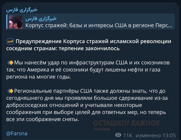Как заявили в КСИР, ранее Тегеран проявлял сдержанность и ограничивал выбор целей для ответных ударов, но теперь эти рамки полностью сняты. Заявление прозвучало после того, как США и Израиль нанесли несколько ударов по иранскому острову Харк — ключевому узлу нефтяного экспорта. В ответ Иран пообещал наносить удары за пределами ближневосточного региона. Ранее Дональд Трамп пригрозил уничтожением иранской цивилизации. Подпишись на БородинLIVE Новости