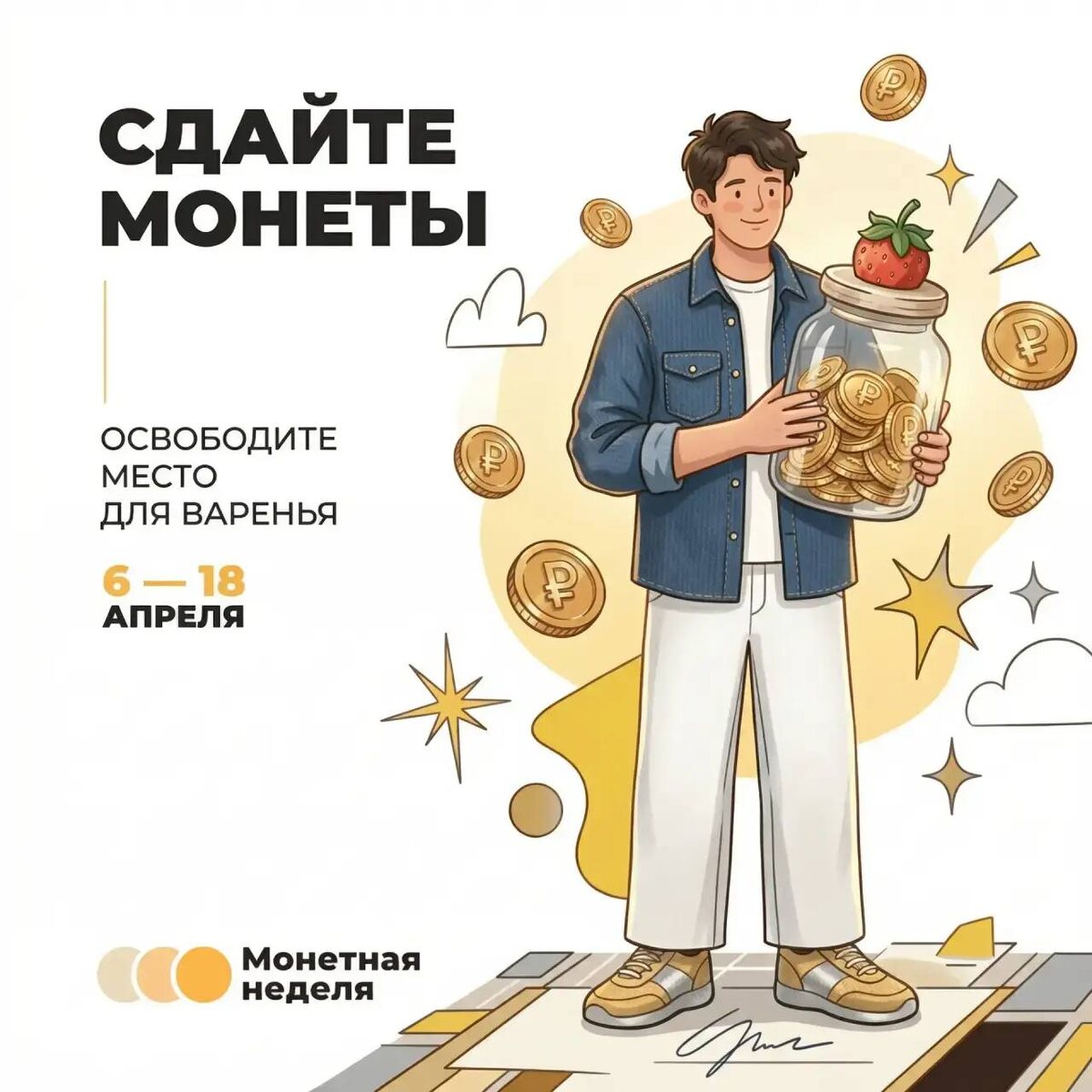 ? Присоединяйтесь к всероссийской акции «Монетная неделя». С 6 по 18 апреля каждый может дать монетам вторую жизнь и обменять их на бумажные деньги или положить на свой счет. Как принять участие в акции? Все просто! Если хотите обменять мелочь, обращайтесь в банки и сетевые магазины, участвующие в акции. Чтобы зачислить сумму на свой банковский счет, достаточно посетить отделения банков-участников. В регионе акция проходит в большинстве городов. Полный список представлен на официальном сайте акции. Здесь можно узнать все подробности и адреса пунктов приема монет: монетнаянеделя.рф А подсчитать ваши наличные поможет Калькулятор монет на сайте акции. А копейки принимают? Можно сдать любые российские монеты, выпущенные с 1997 года: от копейки до 25 рублей. В некоторых отделениях получится обменять простые монеты на памятные. Монетная неделя – отличный повод избавиться от накопившейся мелочи! Акция поможет вернуть в оборот скопившиеся у людей дома монеты, это позволит сократи